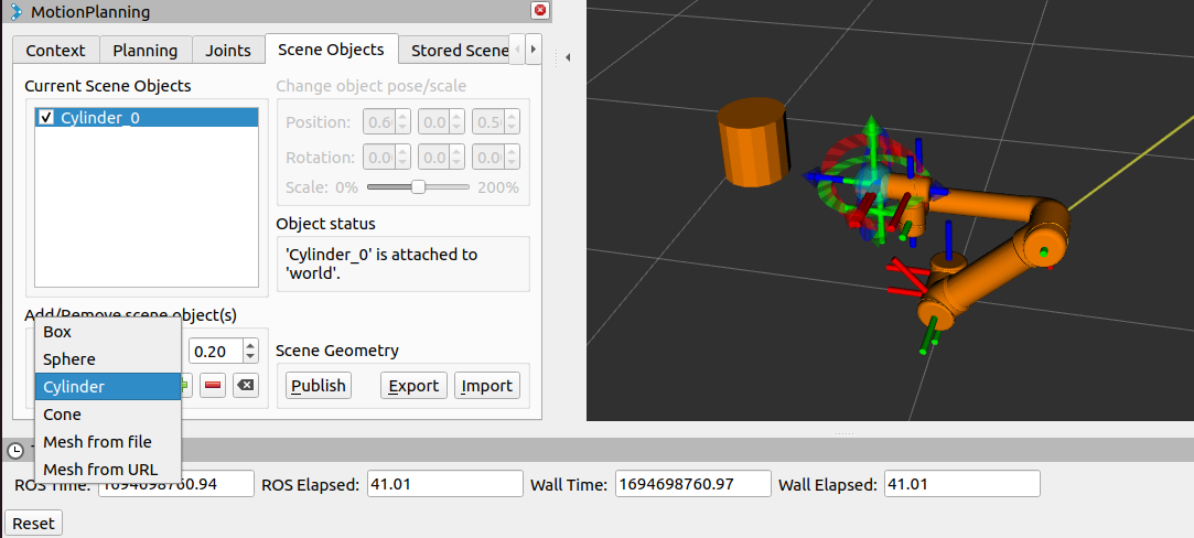 Scene Objectstab in the Motion Planning mini window within Rviz. - Add any primitive object or select any STL file from you PC.