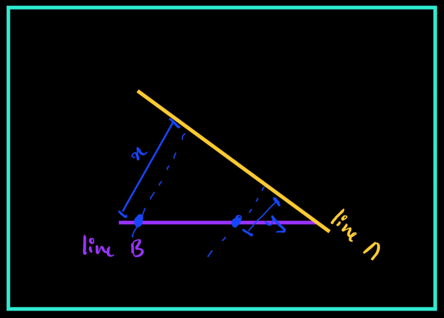 ros2 topic echo /ultrasonic_rl/scan --onceheader: stamp: sec: 1369 nanosec: 404000000 frame_id: ebot_base_link radiation_type: 0 field_of_view: 0.26179999113082886 min_range: 0.029999999329447746 max_range: 4.099999904632568 range: 1.163640022277832 <<<--- Here is the range we need!Using the readings from both sensors, you can find the equation of Line A and you already know the equation of Line B