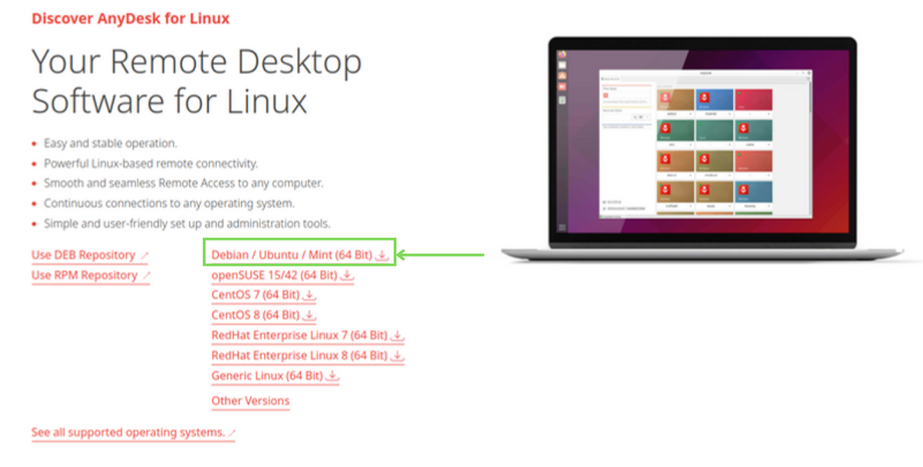 AnyDeskusing the following link on any browser (Chrome for example).Anydesk Website Link - https://anydesk.com/en/downloads/linux